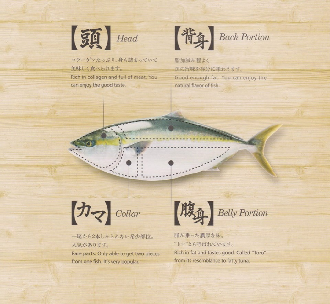 ハマチの解説。腹身(トロ)は脂が乗っていておいしいですね。でも、ハマチのうま味を堪能できるのは背身です。