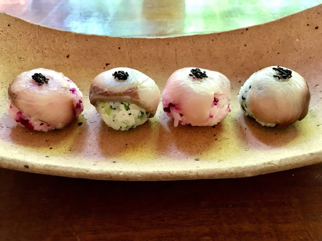 ①白米は少し固めに炊き上げる。ハマチは10等分の薄切りにする。柴漬けと野沢菜漬けはみじん切りにして汁気を絞る。