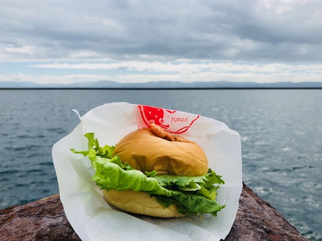 垂水市内にある「海老屋 嘉」さんの海老バーガーです。姫甘海老を使ったハンバーガーでとてもおいしいですよ!