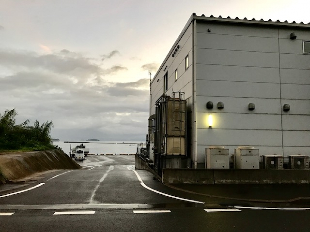 グローバル・オーシャン・ワークスグループ社屋から錦江湾を眺めます。まもなく夜が明けるところです。このところあまり天気が良くないですね。