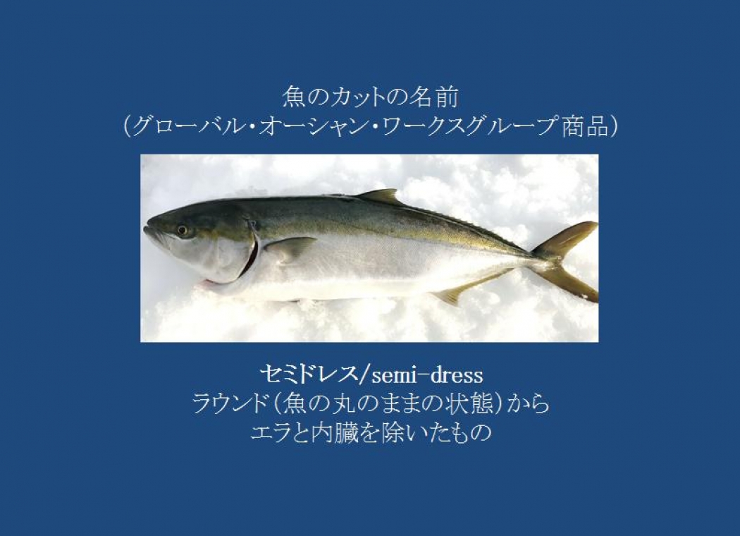 頭、内臓、ヒレを取り除いたものを「ドレス」、内臓とヒレだけを取り除いたものを「セミドレス」という(「子どもと楽しむ 日本びっくり雑学500」 西東社編集部 編集 より)。写真はセミドレス、グローバル・オーシャン・ワークスグループの主力商品です。