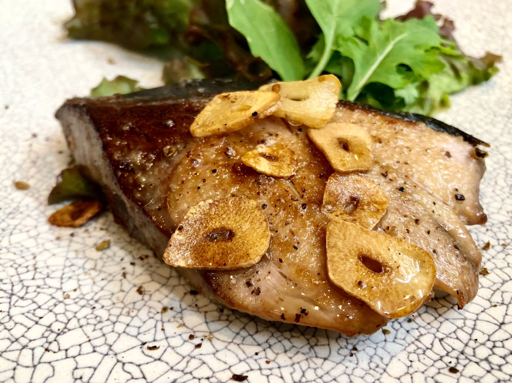 ④同じフライパンにハマチを入れて両面焼く。仕上げにバターを加え、粗挽き黒コショウをふる。③のにんにくを添える。