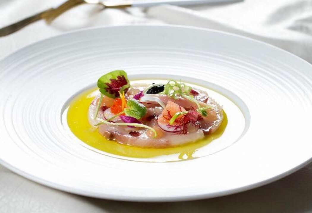 タイ王国、バンコクにある「VIE Hotel Bangkok」の奥田裕也 エグゼクティブ・スーシェフが作る料理「鹿児島垂水産UMAMIハマチのカルパッチョ、フレッシュキャビア、イクラ、柚子のヴィネット、ピンクグレープフルーツとレモンで調和をとって」。昨年のミシュランでビブグルマンを獲得したレストランです。